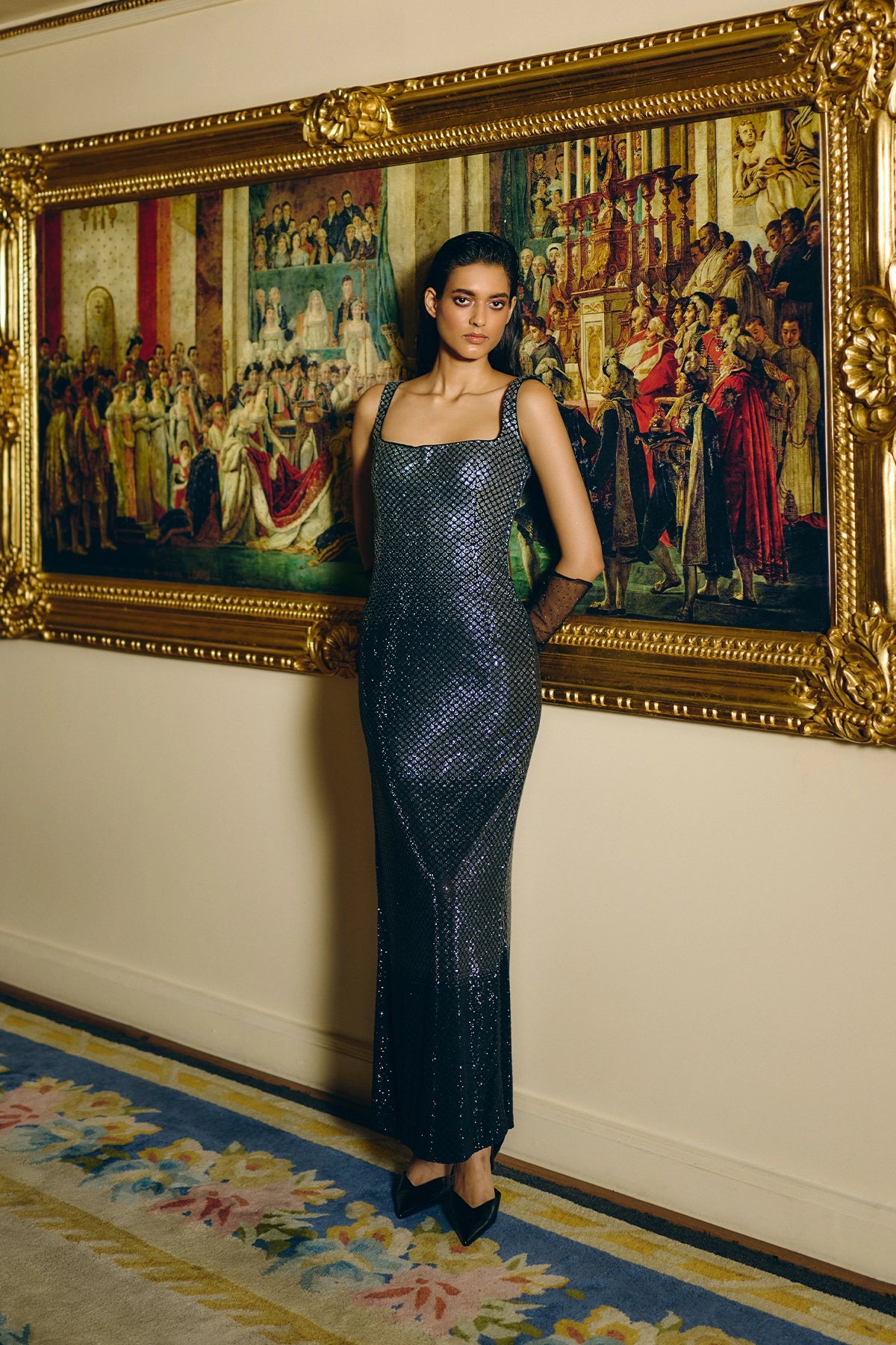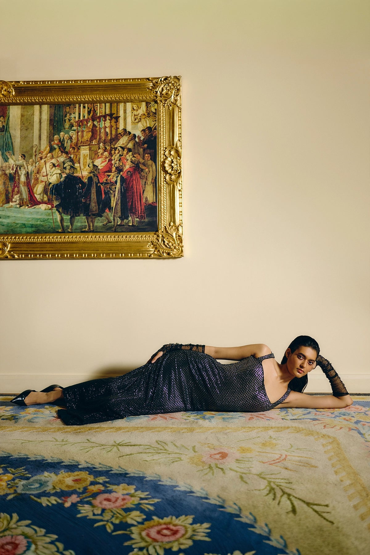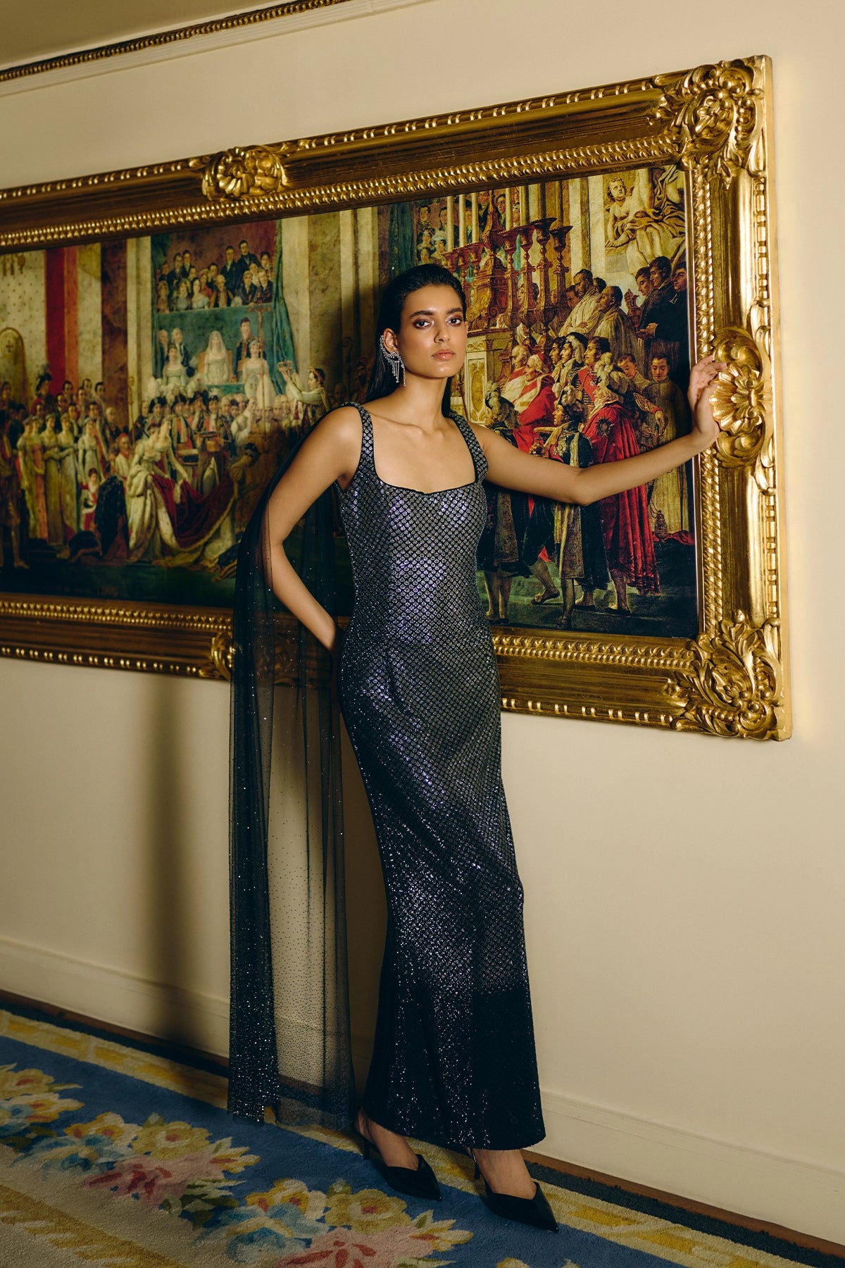 A sculpted corset transitions seamlessly into a fluid, draped sheath skirt, evoking the quiet power of Sakura at dusk. Adorned in ombré Swarovski and finished with gloves and a delicate shoulder drape, it radiates modern opulence.
