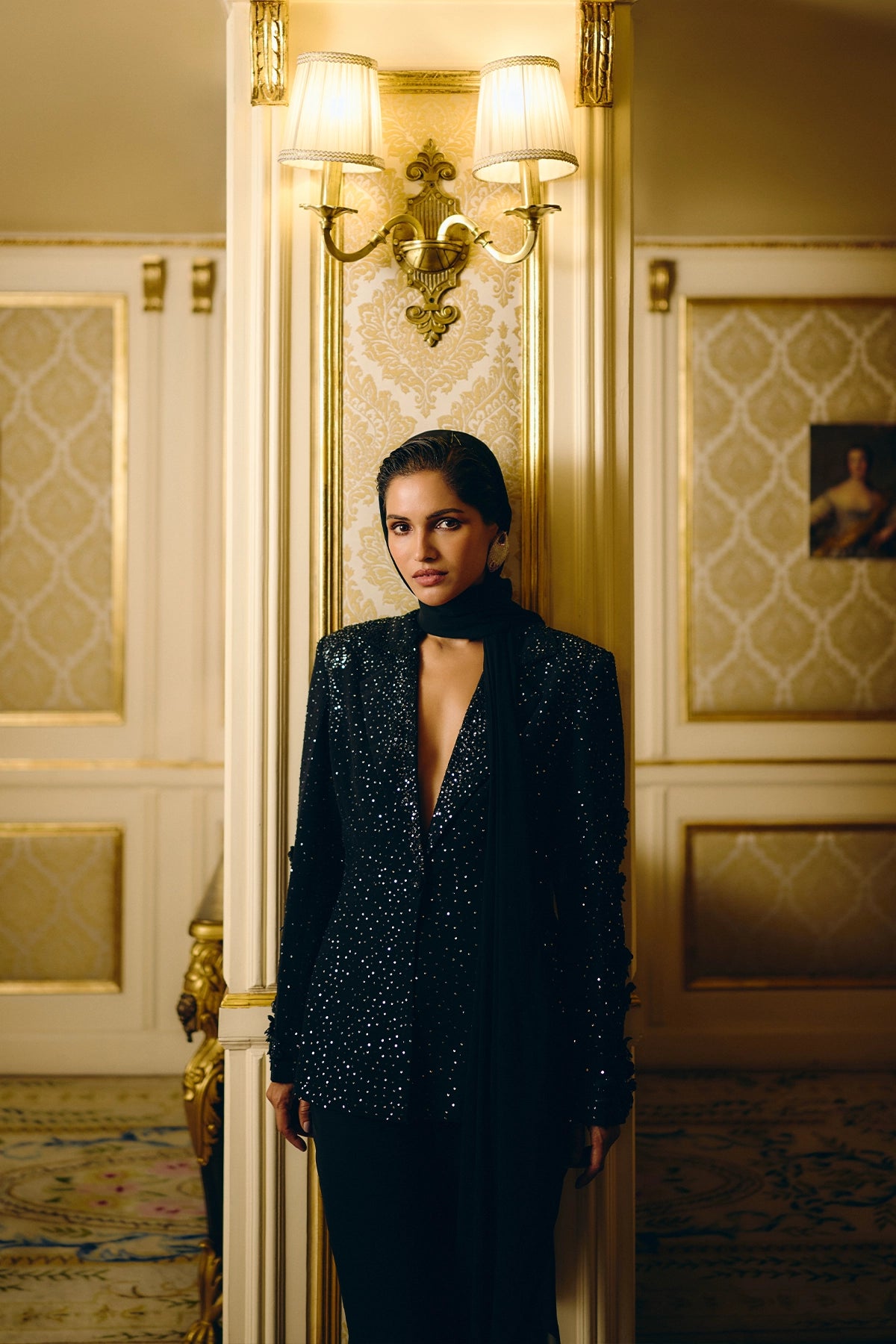Where precision meets poetry — the blazer’s structured form melts into a soft drape and flared pant. Embellished blossoms whisper the elegance of moonlit gardens.